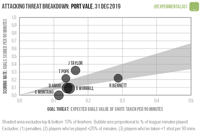 Whilst Jake Taylor’s return of a 0.3 goals every 90 minutes is exceptional, Bennett’s returns of around 0.2 per 90 is disappointing. Bennett is, by a massive margin, our best player at being in the right place at the right time. He just isn’t scoring these chances.